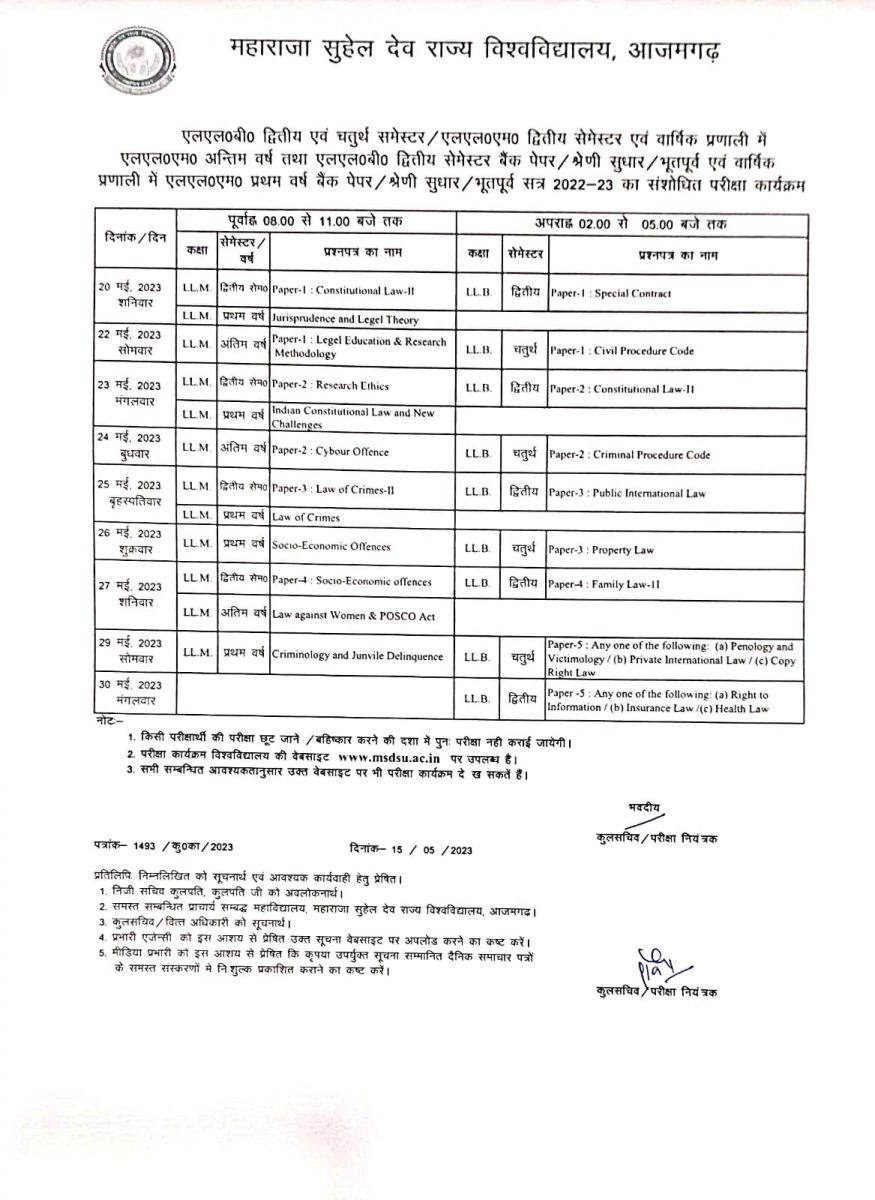 एलएल०बी० द्वितीय एवं चतुर्थ समेस्टर / एलएल०एम० द्वितीय सेमेस्टर एवं वार्षिक प्रणाली में एलएल०एम० अन्तिम वर्ष तथा एलएल०बी० द्वितीय सेमेस्टर बैंक पेपर / श्रेणी सुधार / भूतपूर्व एवं वार्षिक प्रणाली में एलएल0एम0 प्रथम वर्ष बैंक पेपर / श्रेणी सुधार / भूतपूर्व सत्र 2022-23 का संशोधित परीक्षा कार्यक्रमके सम्बन्ध में |