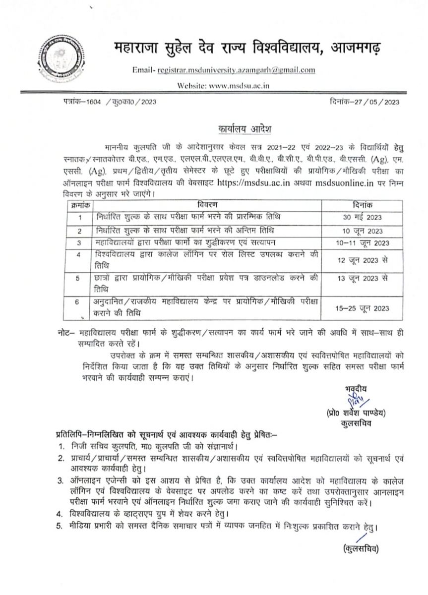 2021-22 एवं 2022-23 के विद्यार्थियों हेतु स्नातक स्नातकोत्तर बी.एड., एम.एड. एलएल. बी. एलएल. एम. बी.बी.ए., बी.सी.ए. बी.पी.एड., बी.एससी. (Ag), एम. एससी. (Ag). प्रथम/द्वितीय/ तृतीय सेमेस्टर के छूटे हुए परीक्षार्थियों की प्रायोगिक / मौखिकी परीक्षा का ऑनलाइन परीक्षा फार्म के सम्बन्ध में |